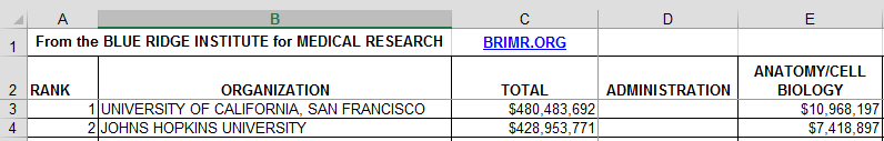 To put the Data Interpreter to the test, I used a spreadsheet containing National Institutes of Health (NIH) funding information for medical schools by department. This dataset is compiled annually from the original NIH source data by the Blue Ridge Institute for Medical Research, and the 2014 file can be found here: