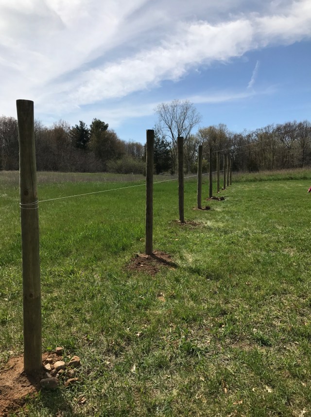After about three hours last Saturday, I had the back row 64 ft. in place. In the photo below, you can see the new line beyond the original. If you have a keen eye, you’ll also notice that we’re not doing a garden this year. There’s no time to manage a garden that size as a hobby this year.