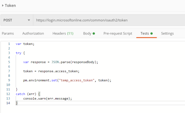 The code used in Tests parses the JSON response and assigns the access_token provided from Microsoft to the temp_access_token variable.